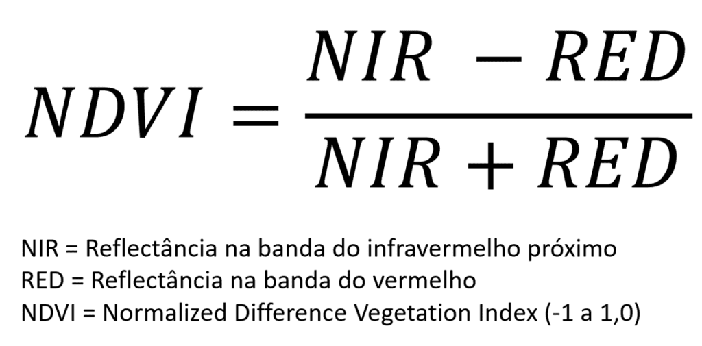 Em termos práticos, o NDVI é calculado a partir de uma imagem multiespectral obtida por satélites ou drones. Sobre cada pixel nesta imagem e considerando a reflectância das bandas do vermelho e infravermelho próximo, realizamos o seguinte cálculo: